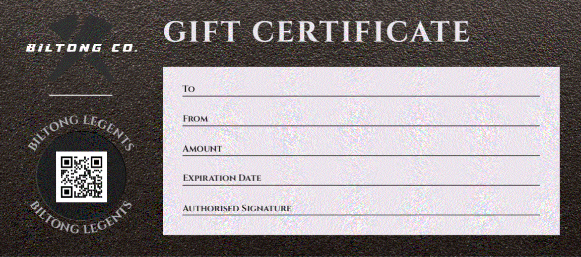 Biltong Leaves from $33.75 View Options Biltong Slab from $28.00 View Options Biltong Sliced from $28.00 View Options Droewors Wheels from $28.00 View Options Cabanossi from $33.75 View Options Droewors from $28.00 View Options Koeksister $20.00 Sold Out Sold Out Added! Traditional Boerewors $17.50 View Options Bacon Bites from $33.75 Select Size 250g 500g 1Kg Add To Cart Added! Gift Certificate from $25.00 Select Value $25.00 $50.00 $75.00 $100.00 Purchase Added!